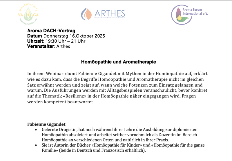 In ihrem Webinar räumt Fabienne Gigandet mit Mythen in der Homöopathie auf, erklärt wie es dazu kam, dass die Begriffe Homöopathie und Aromatherapie nicht im gleichen Satz erwähnt werden und zeigt auf, wann welche Potenzen zum Einsatz gelangen und warum. Die Ausführungen werden mit Alltagsbeispielen veranschaulicht, bevor konkret auf die Thematik «Resilienz» in der Homöopathie näher eingegangen wird. Fragen werden kompetent beantwortet.