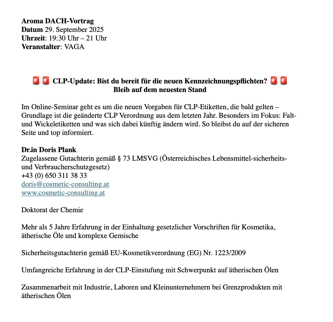 Im Online-Seminar geht es um die neuen Vorgaben für CLP-Etiketten, die bald gelten – Grundlage ist die geänderte CLP Verordnung aus dem letzten Jahr. Besonders im Fokus: Falt- und Wickeletiketten und was sich dabei künftig ändern wird. So bleibst du auf der sicheren Seite und top informiert.
