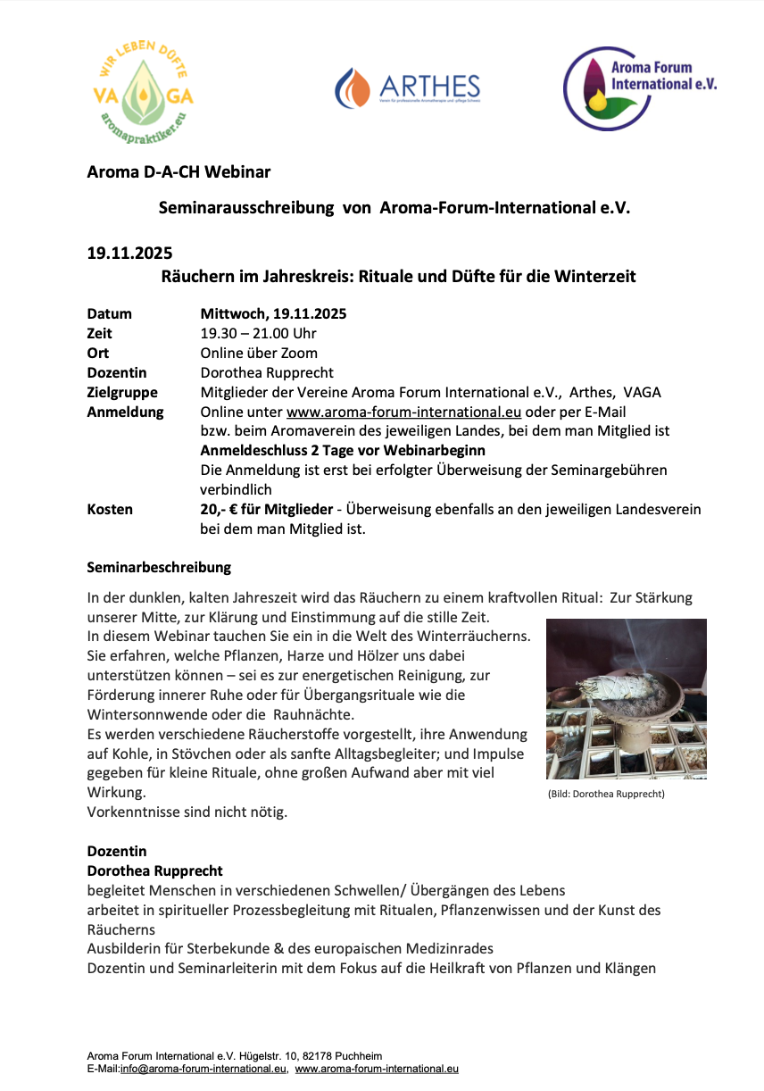 In der dunklen, kalten Jahreszeit wird das Räuchern zu einem kraftvollen Ritual: Zur Stärkung unserer Mitte, zur Klärung und Einstimmung auf die stille Zeit. In diesem Webinar tauchen Sie ein in die Welt des Winterräucherns. Sie erfahren, welche Pflanzen, Harze und Hölzer uns dabei unterstützen können – sei es zur energetischen Reinigung, zur Förderung innerer Ruhe oder für Übergangsrituale wie die Wintersonnwende oder die Rauhnächte.